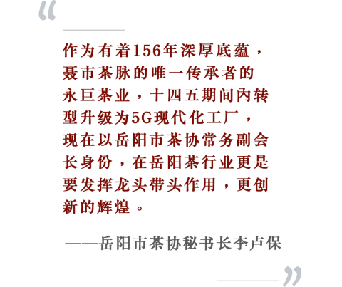 岳陽市茶協(xié)會(huì)長鄭劍山對(duì)永巨成為常務(wù)副會(huì)長單位也表達(dá)了祝賀,高度肯定了永巨茶旅融合的發(fā)展思路,鼓勵(lì)永巨在黃茶、黑茶相結(jié)合的新賽道上進(jìn)行更多的探索。